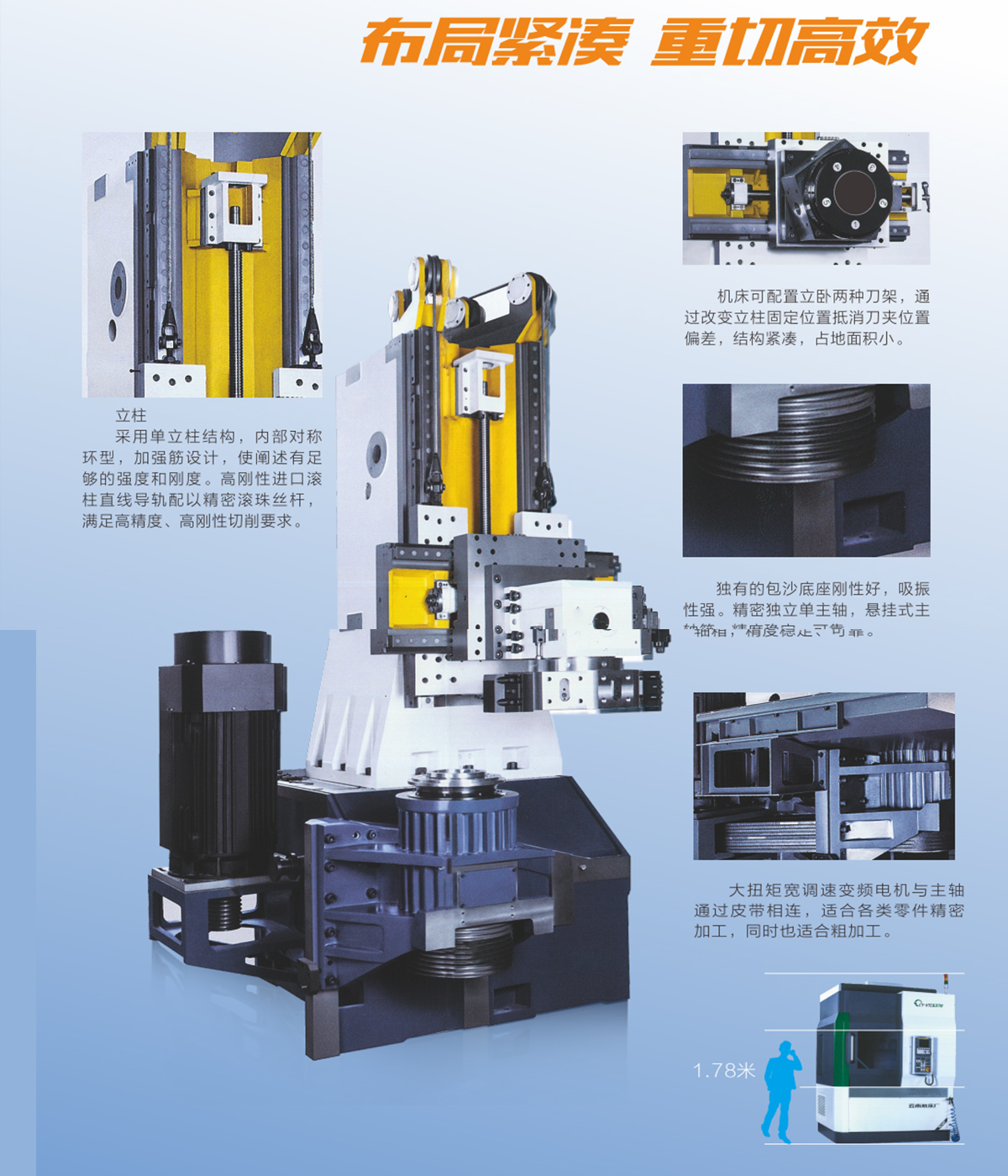 数控立式车床系列总体布局合理紧凑、占地面积小;高刚性、精密独立单主轴,包砂底座设计刚性和抗震性好。整机具有加工能力大、精度稳定和加工效率高的特点。机床控制系统具有严密的保护措施,保证人身和设备安全。主要应用于汽配、电机壳、轴承环、阀体及水泵等行业。